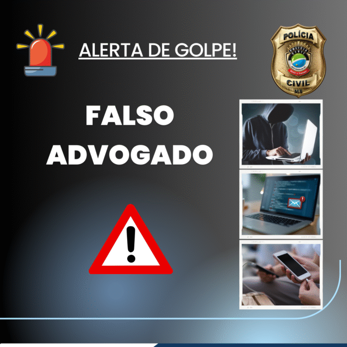 A Polícia Civil de Mato Grosso do Sul informa sobre um golpe crescente envolvendo falsos advogados. Criminosos têm se aproveitado do nome de profissionais da área e de escritórios de advocacia para enganar indivíduos e extorquir dinheiro.