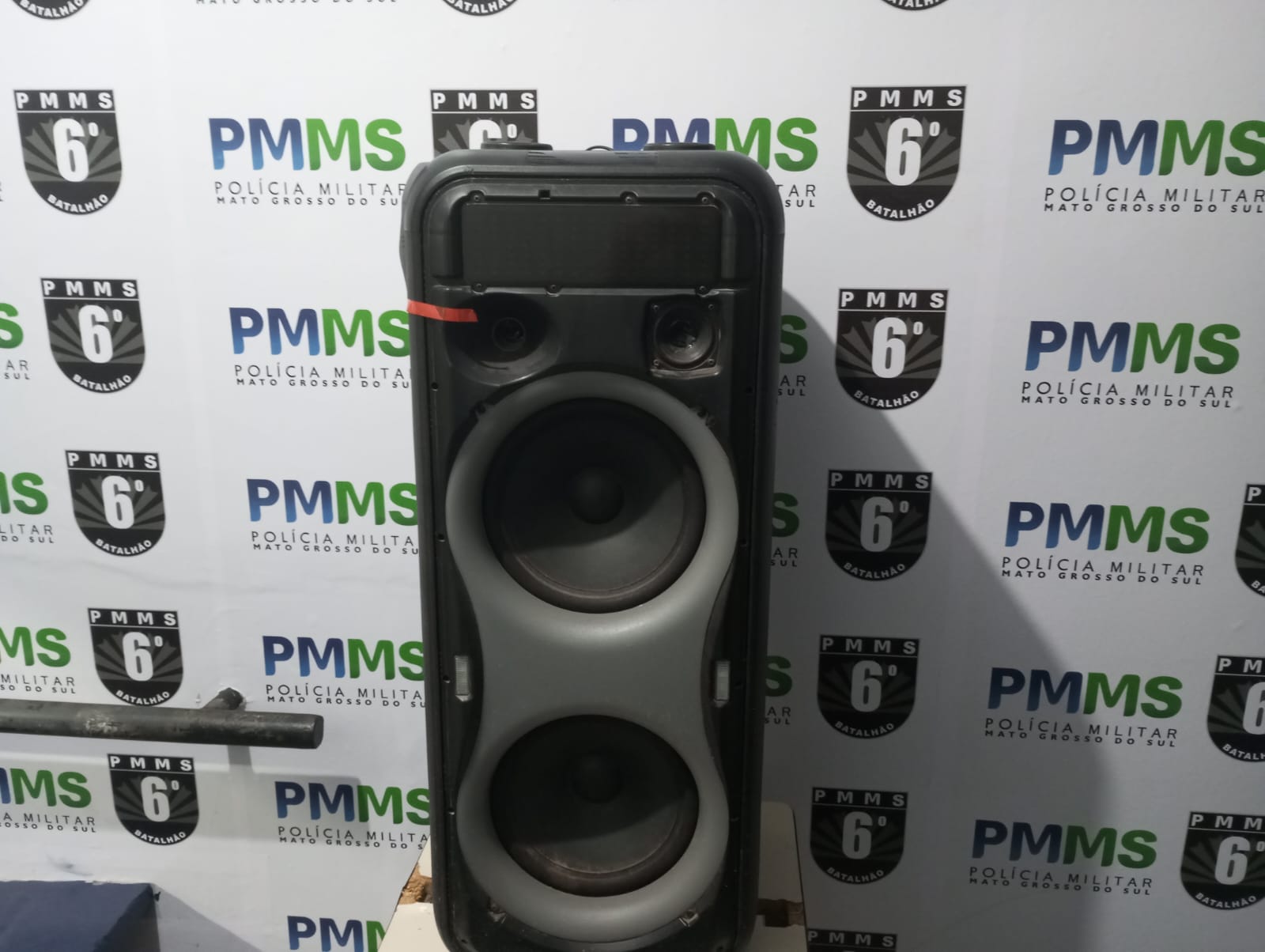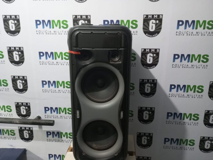 O chamado foi recebido pelo COPOM e a equipe da Rádio Patrulha deslocou-se ao local. A denúncia apontava que uma caixa de som, colocada em frente a uma residência, estava sendo usada em volume excessivo de forma recorrente.