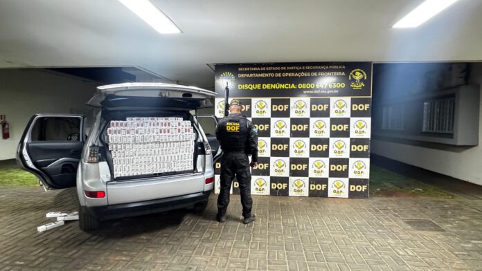 Policiais do Departamento de Operações de Fronteira (DOF) realizaram a apreensão de um veículo MMC Outlander na BR-376, em Deodápolis, na última segunda-feira, 10. A fiscalização resultou na captura de 1.800 pacotes de cigarros contrabandeados do Paraguai, além da detenção de um homem de 28 anos.