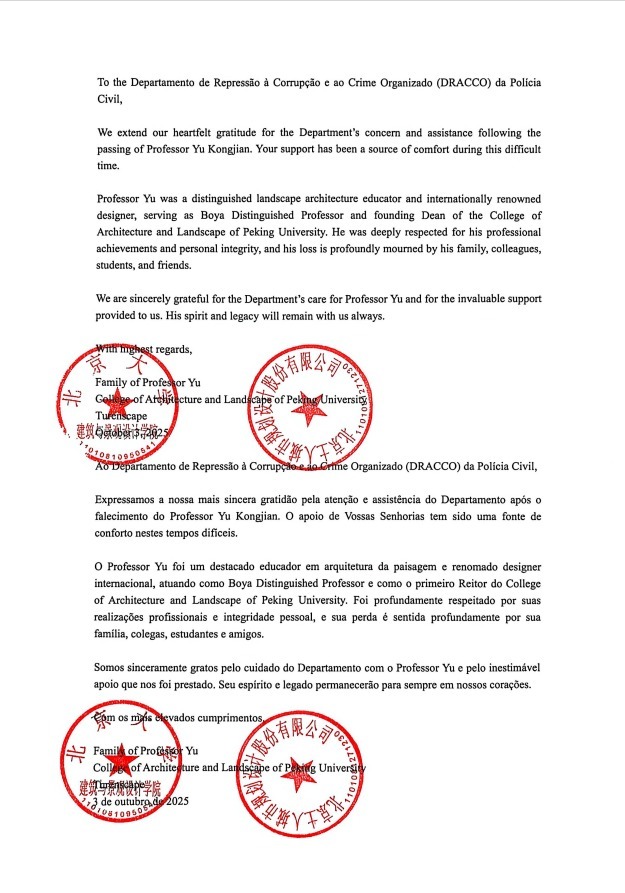 A família do professor Yu, assim como representantes do College of Architecture and Landscape da Universidade de Pequim, também expressaram agradecimento pela atuação das autoridades no decorrer do processo.
