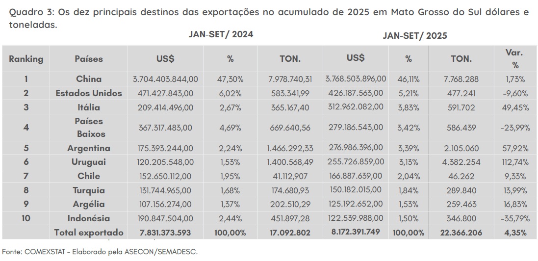 No intervalo de janeiro a setembro de 2025, Mato Grosso do Sul registrou um valor de exportações de US$ 8,18 bilhões, conforme dados divulgados pela Secretaria de Meio Ambiente, Desenvolvimento, Ciência, Tecnologia e Inovação (Semadesc).