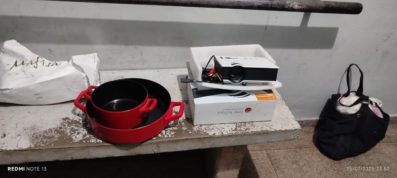 Durante a abordagem, os policiais encontraram um projetor da marca SMP, acompanhado de todos os acessórios, além de duas panelas de ferro da marca Electrolux. A mulher alegou que os itens teriam sido “encontrados no lixo”, mas testes realizados mostram que o projetor estava em perfeito funcionamento.