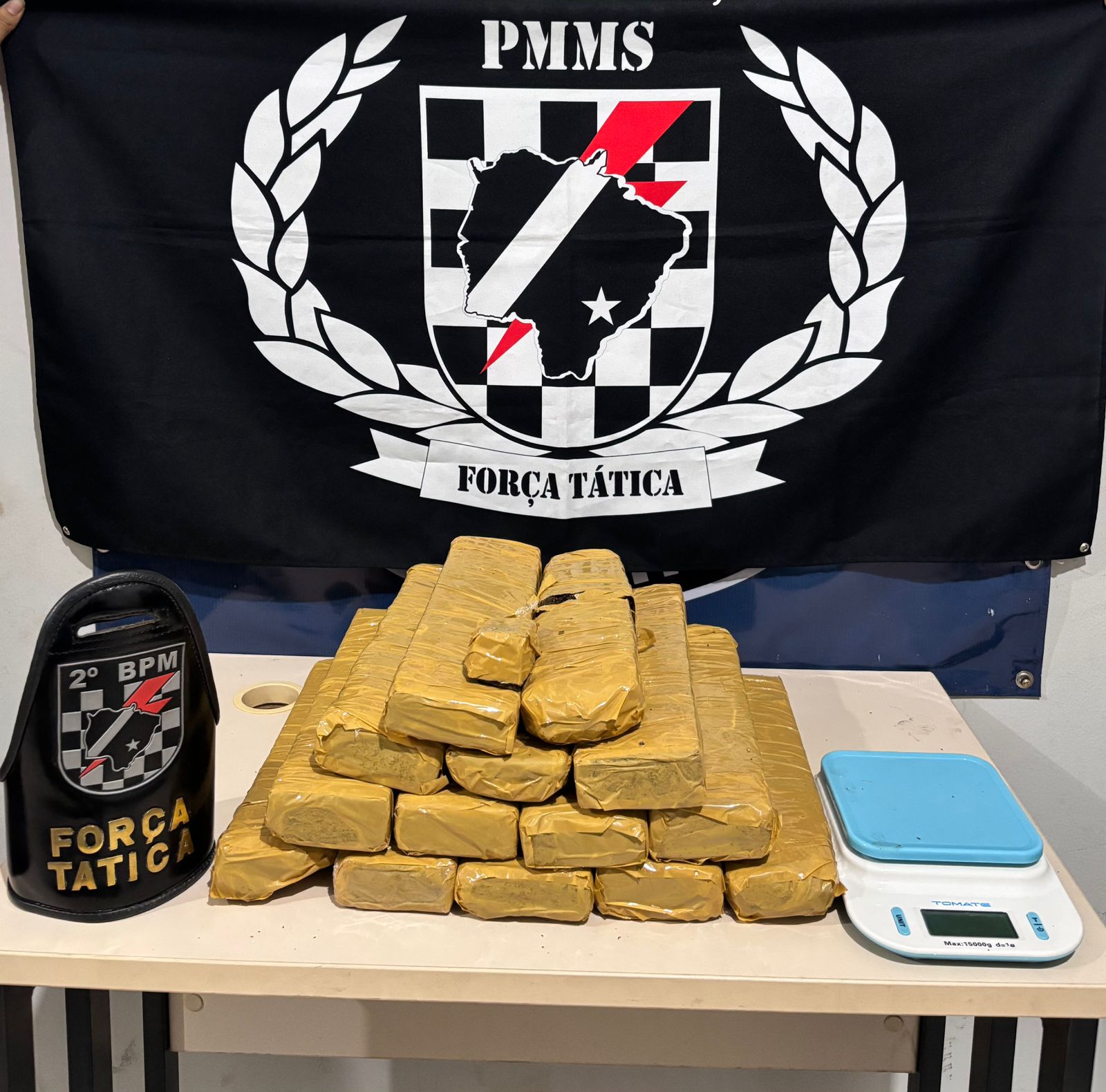 Durante vistoria em um dos quartos, os policiais encontraram uma balança de precisão sobre uma mala. No interior foram localizados 15 tabletes de maconha, totalizando 14 quilos e 236 gramas.