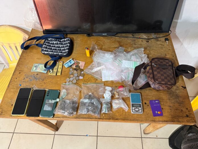 Durante o cumprimento de um mandado de busca e apreensão em um imóvel situado no bairro Boa Vista, os agentes encontraram drogas, dinheiro, uma balança de precisão e vários invólucros utilizados para a comercialização de entorpecentes. Um jovem de 18 anos foi preso em flagrante por tráfico, enquanto um usuário foi levado para prestar esclarecimentos.