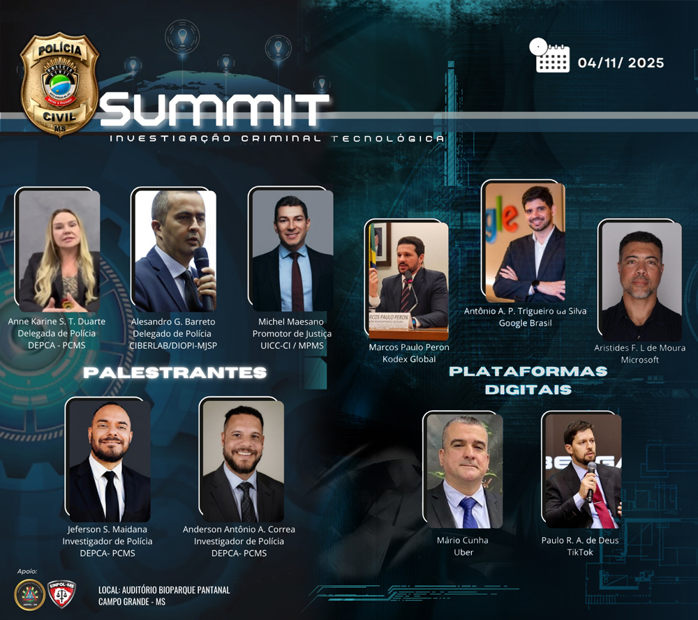 No dia 4 de novembro, a Polícia Civil de Mato Grosso do Sul realizará o Summit de Investigação Criminal Tecnológica em Campo Grande. O evento ocorrerá das 8h às 17h no Auditório Bioparque Pantanal e reunirá representantes das Polícias Civis e Federais, do Ministério Público, do Judiciário e de grandes empresas de tecnologia.