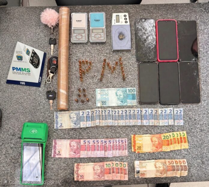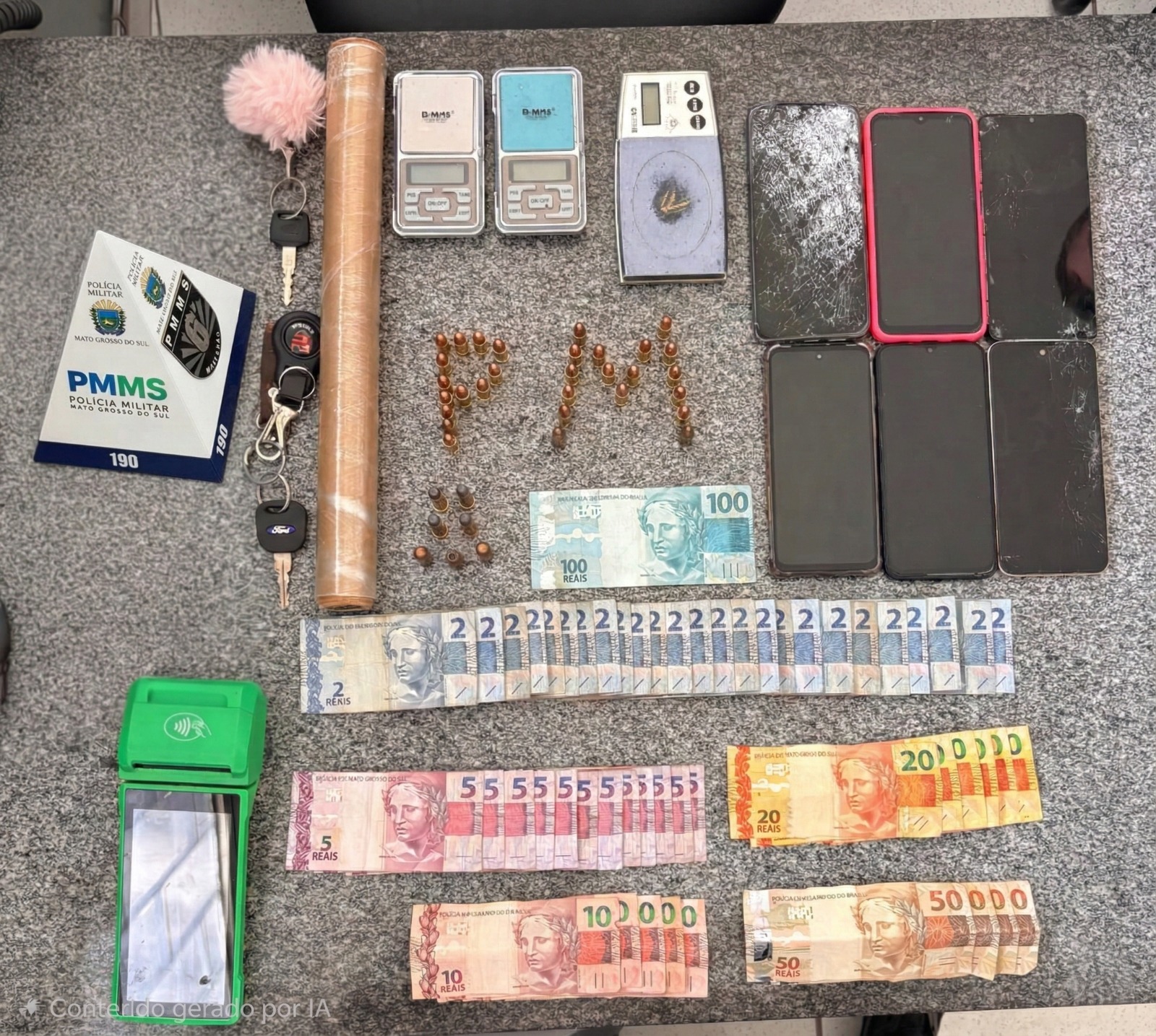 Na busca pessoal foram encontradas 30 munições calibre 9mm em posse de um dos abordados, sem documentação que autorizasse o porte. Em diligências complementares, com apoio dos cães de detecção K9 Pacu e K9 Zeck, as equipes localizaram ainda munições calibres .40 e .357, balanças de precisão, aparelhos celulares e dinheiro em cédulas fracionadas.