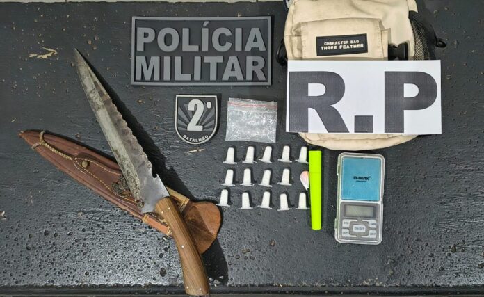 Durante a ronda na rua Vinte e Nove, os policiais abordaram dois suspeitos em um local identificado como ponto de venda de entorpecentes. Ao ser questionado, um dos abordados indicou onde a droga estava escondida. A equipe encontrou 14 pinos e uma trouxinha de cocaína.