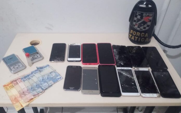 Durante a abordagem, foram encontradas pedras de crack, que o casal admitiu ter adquirido dele. Além disso, ao inspecionar a área, a polícia descobriu, escondidas dentro de um tênis, duas balanças de precisão e doze celulares, que supostamente foram trocados por drogas.