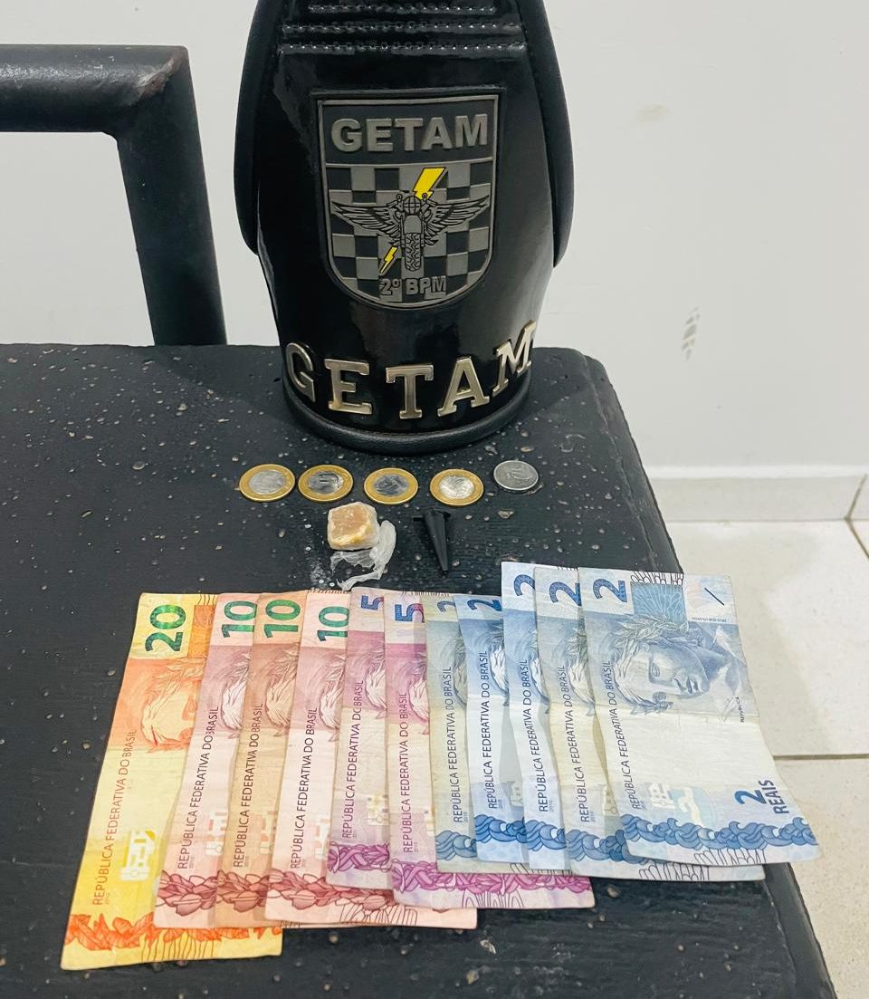 Durante as rondas, uma equipe do Grupamento de Escolta e Transporte de Apenados (GETAM) observou alguns indivíduos na praça pública. Dois deles estavam em atividades que indicavam a comercialização de entorpecentes. Ao serem abordados, um jovem de 18 anos tentou engolir uma porção de droga. Os policiais conseguiram apreender um “pino” de cocaína com peso de 1,1 gramas e um pacote contendo 5,2 gramas de crack.