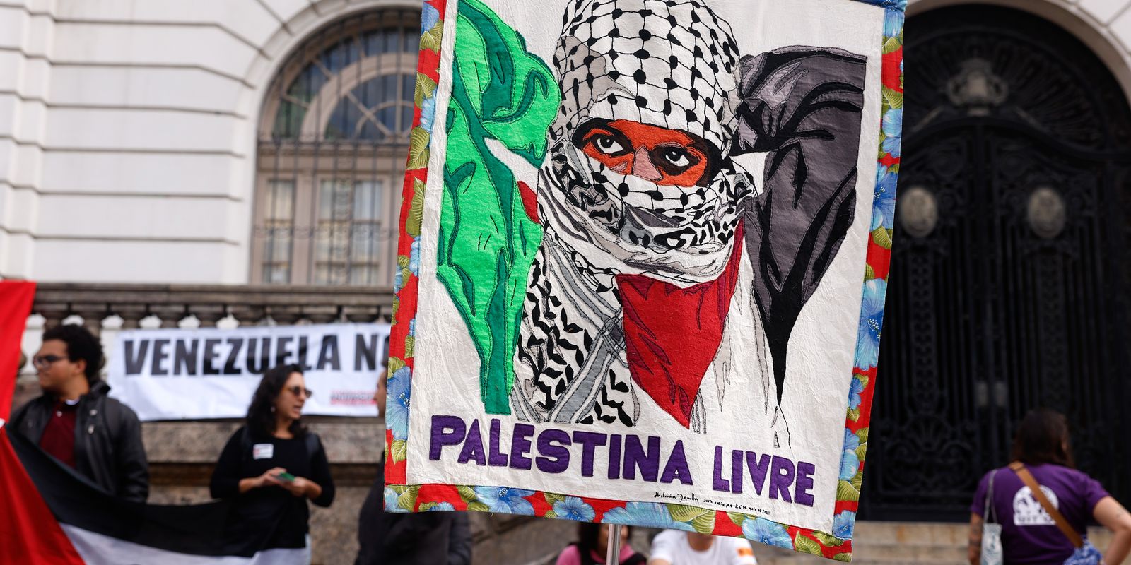 Entre os discursos da manifestação, destacou-se a crítica ao Estado de Israel como um ente artificial criado pela ONU em 1948, uma data marcada por deslocamentos forçados de palestinos.