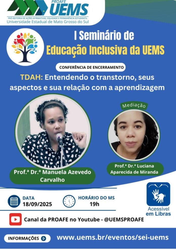A Universidade Estadual de Mato Grosso do Sul (UEMS) promoverá o 1º Seminário de Educação Inclusiva entre os dias 16 e 18 de setembro de 2025. A iniciativa é coordenada pela Pró-Reitoria de Ações Afirmativas, Equidade e Permanência Estudantil (PROAFE) e pela Divisão de Inclusão Educacional (DINE). O evento terá um formato híbrido, com inscrições gratuitas, sendo que as vagas presenciais são limitadas e serão preenchidas por ordem de inscrição.